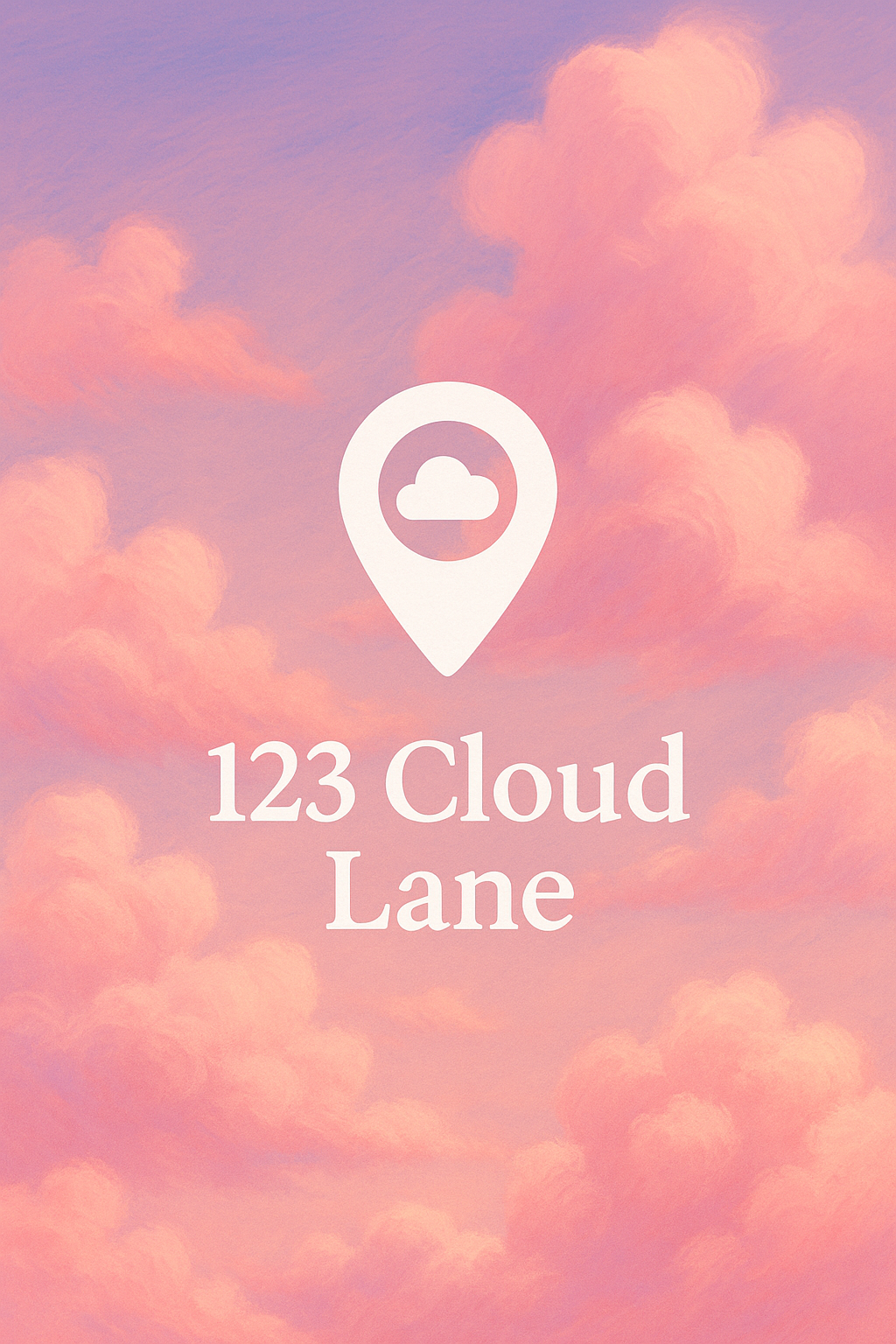 Charming graphic featuring a dreamy pastel sky with clouds, ideal for showcasing a location. The design combines soft colors and a playful icon, perfect for branding or promotional use.