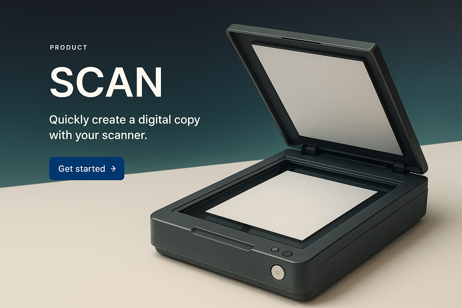 A modern web design layout featuring an open scanner, emphasizing ease of use. The gradient background transitions from dark to white, creating a sleek aesthetic.