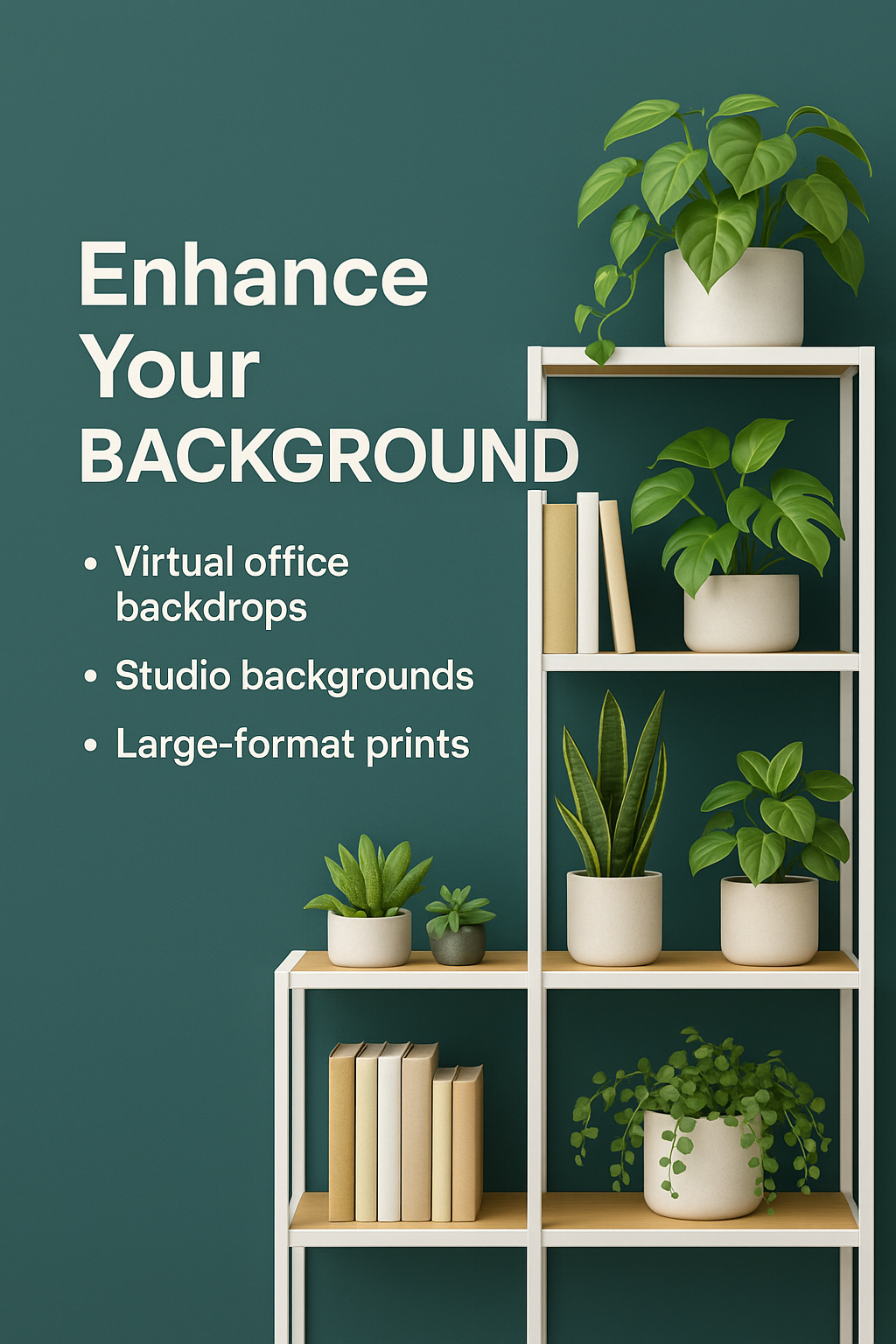 Modern Office Background Display with Plants and Shelves