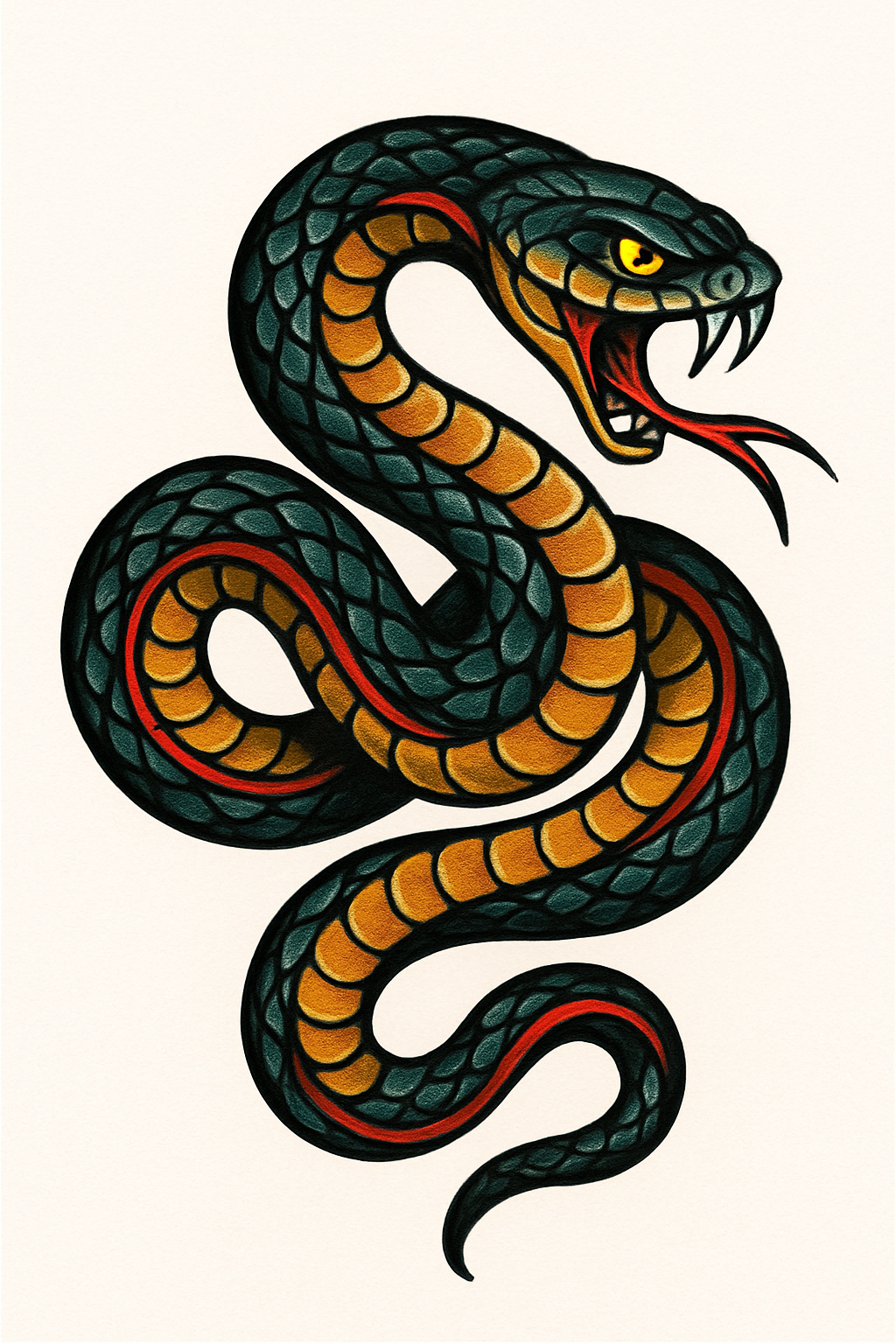 A striking illustration of a snake featuring vibrant colors and a dynamic pose, ideal for tattoo designs, merchandise, or artistic projects.