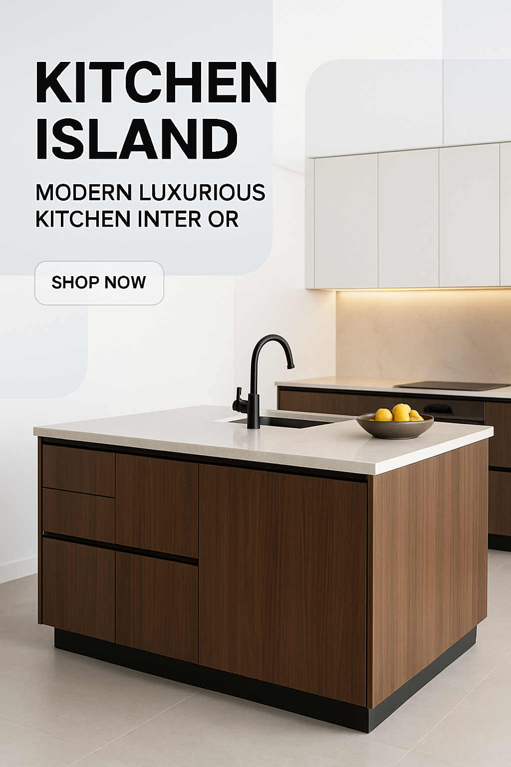 /Collection: /by davooda/Type: PNG/A sleek kitchen island showcases a modern luxurious design with clean lines and a bright, geometric background. It features bold typography and a balanced layout for visual harmony.