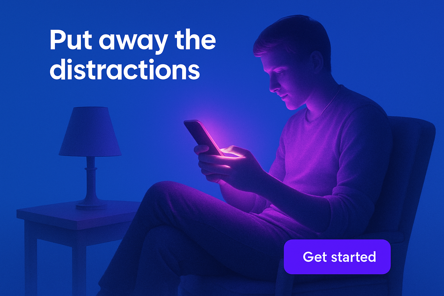 A person sitting in a chair, immersed in their phone's neon-pink glow. The surrounding atmosphere is colored in cool shades of blue and violet, enhancing the focus on the device.