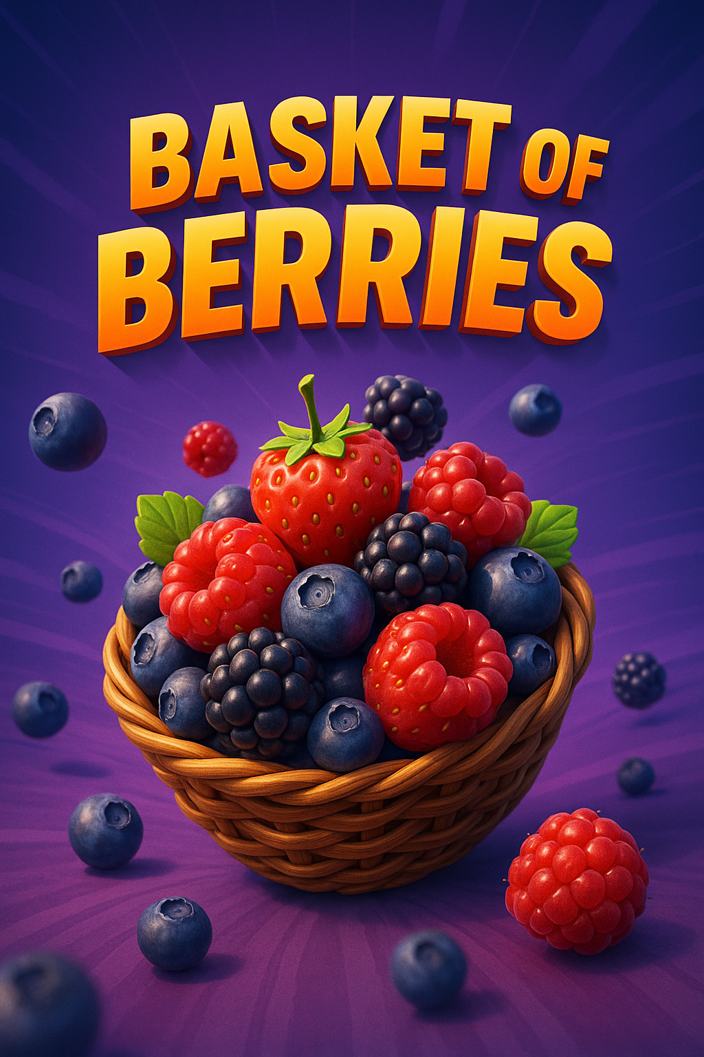 /Collection: /by davooda/Type: PNG/A lively illustration of a basket filled with assorted berries, including strawberries, blueberries, and raspberries, set against a dynamic purple background with radiant lines. The title is bold and eye-catching.