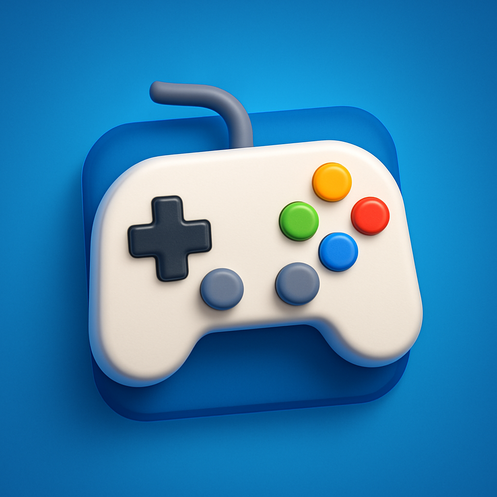 Stylized 3D icon of a game controller set against a blue background, ideal for gaming apps and platforms. The design features bright colors and a playful aesthetic.