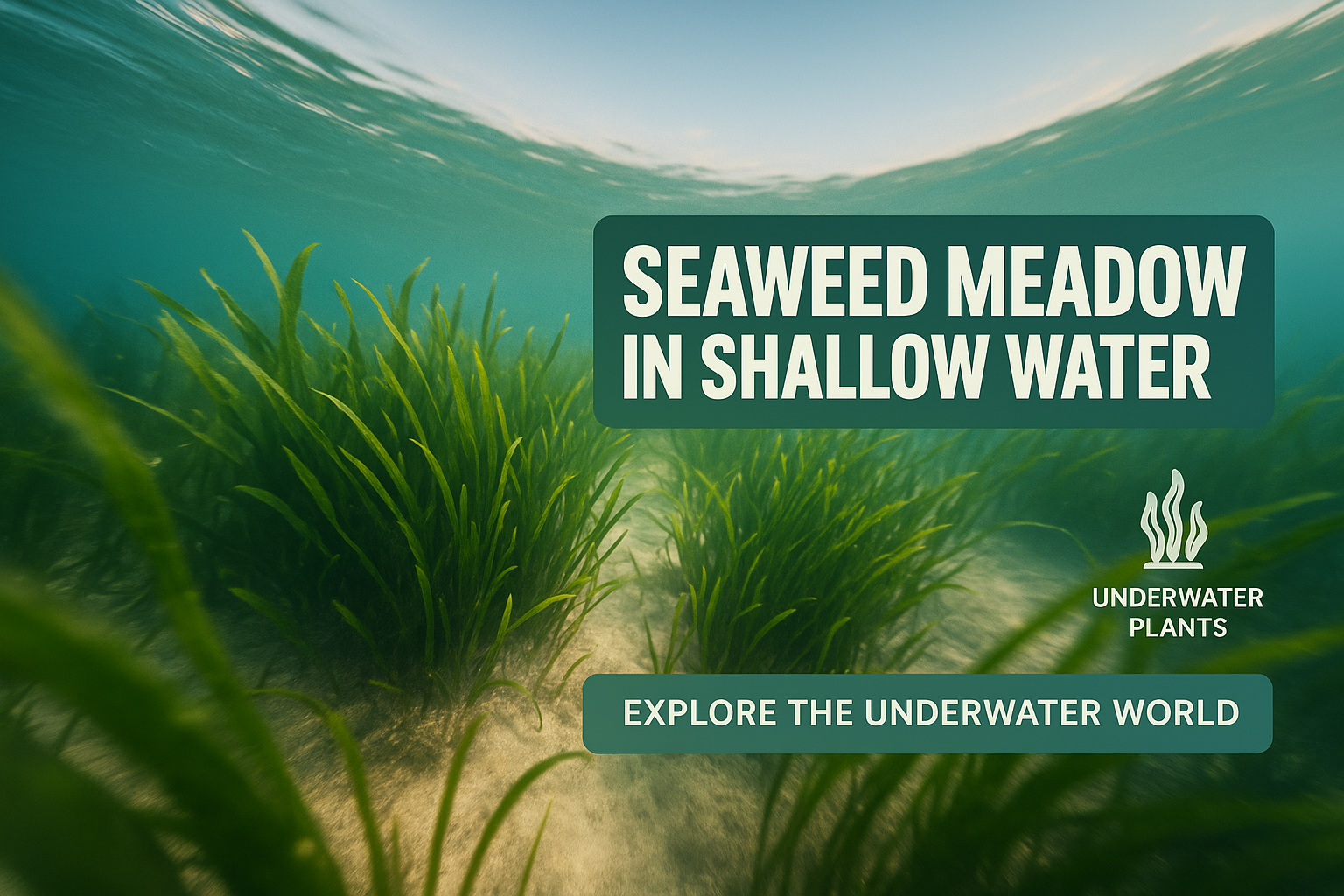 Serene underwater landscape showcasing a vibrant seaweed meadow in shallow water, ideal for educational content about marine life and ecosystems.