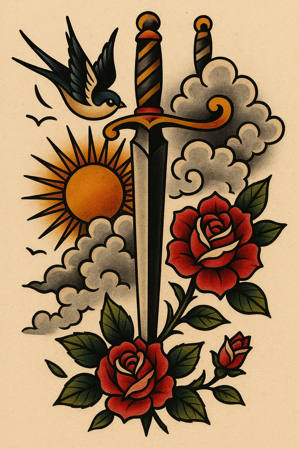 /Collection: /by davooda/Type: PNG/This image showcases a vintage tattoo style design featuring a sword, roses, and clouds with a sun. The bold colors and traditional elements appeal to tattoo enthusiasts and artists.