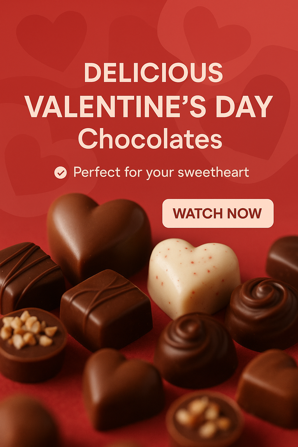 A vibrant promotional image featuring an assortment of heart-shaped chocolates, ideal for Valentine's Day marketing. The design captures a romantic theme suitable for social media and online advertising.