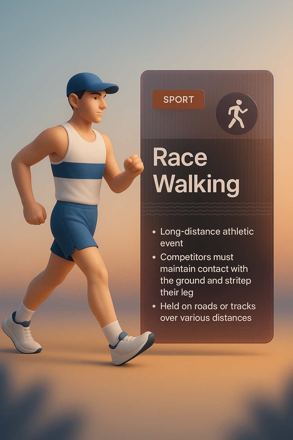 /Collection: /by davooda/Type: PNG/A bright 3D illustration depicting a race walker in motion, complemented by a translucent overlay containing text about the sport. The design features a gradient background and easy-to-read white text.