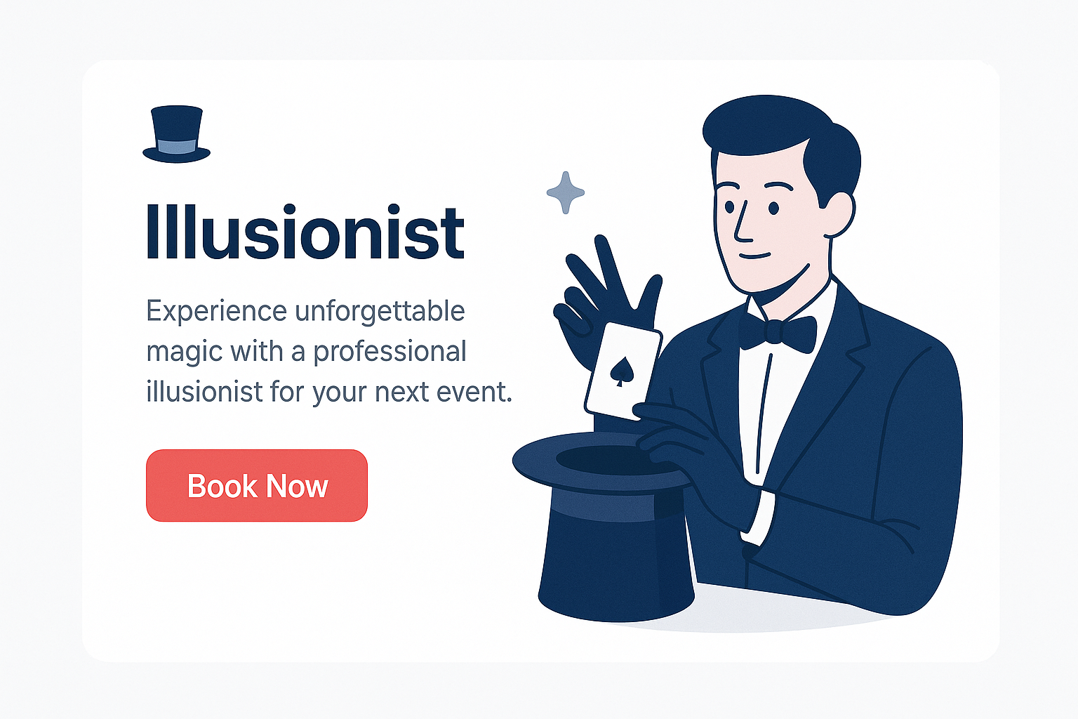 /Collection: /by davooda/Type: PNG/A clean and professional landing page design featuring an illusionist. The layout includes a text section for details and a vibrant call-to-action button to book services.