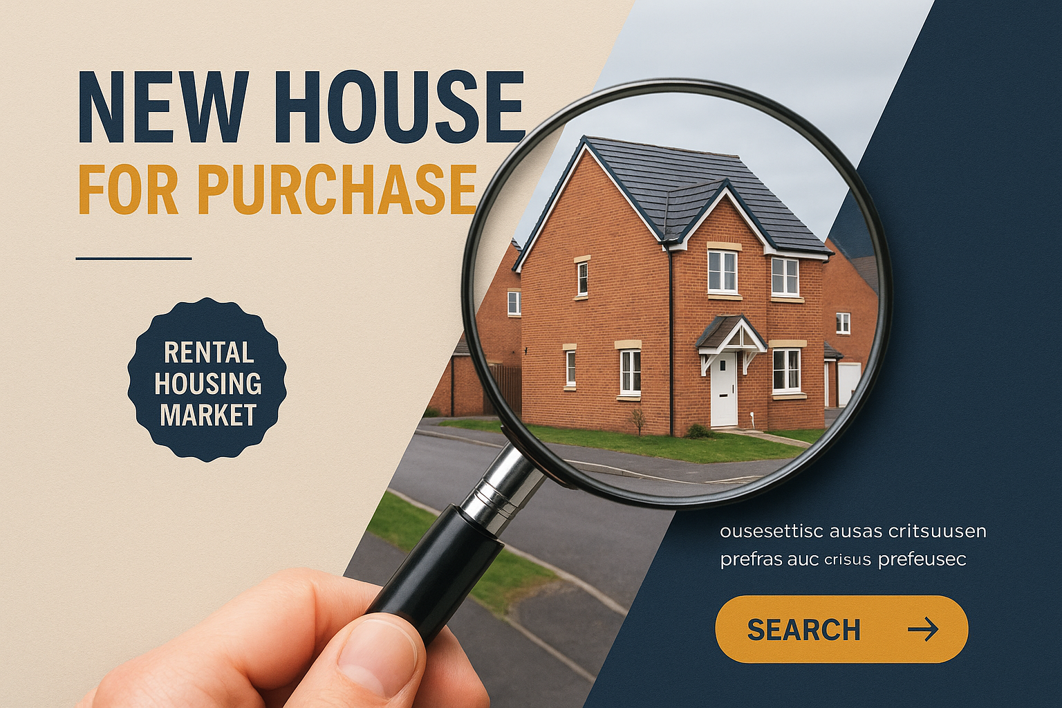 /Collection: /by davooda/Type: PNG/An engaging visual featuring a magnifying glass over a residential building, highlighting the search for new houses in the rental market. The design includes contrasting colors and layered elements for a professional look.