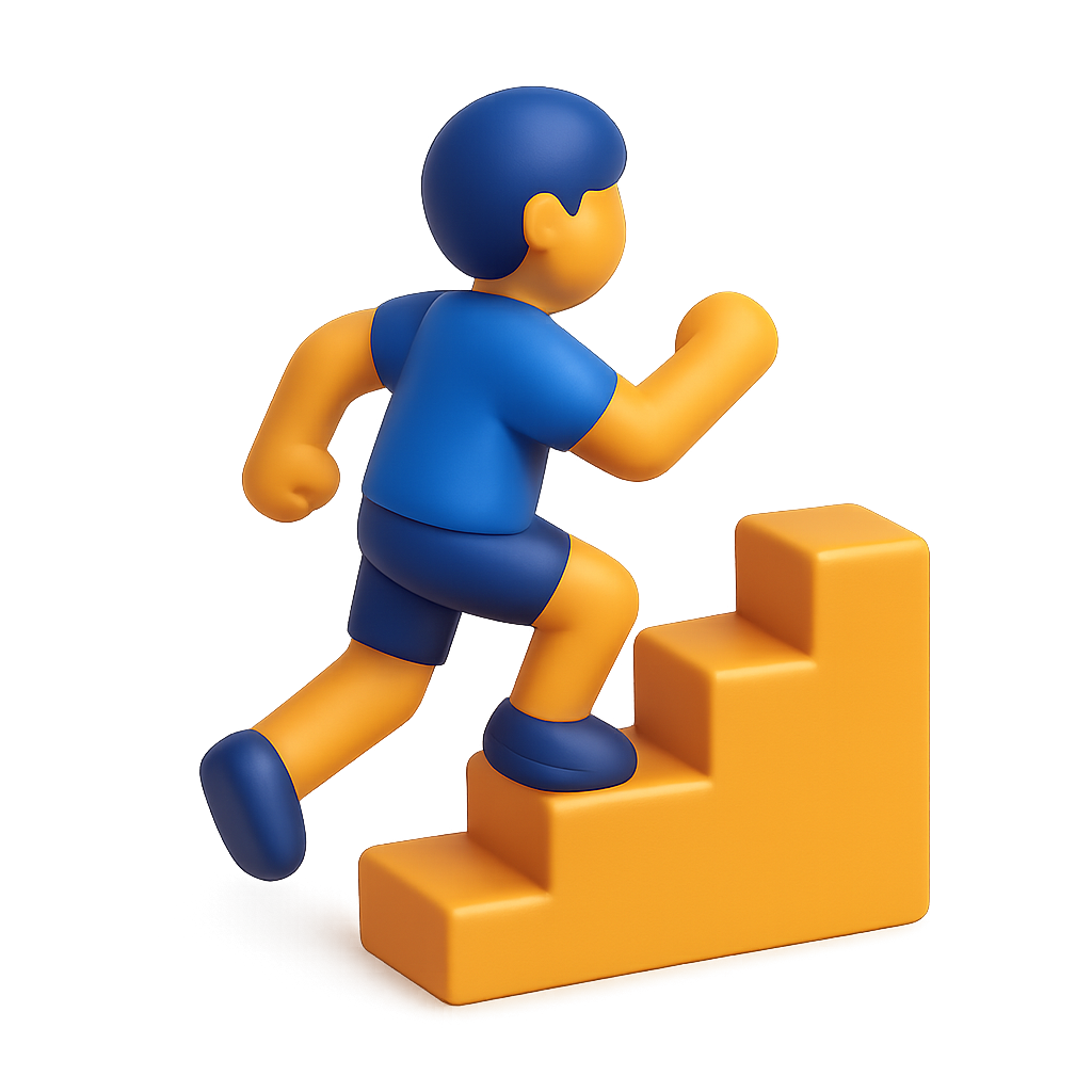 A vibrant 3D icon depicting a person in a blue outfit running up orange steps. The design features a three-quarter view, showcasing a dynamic upward movement.