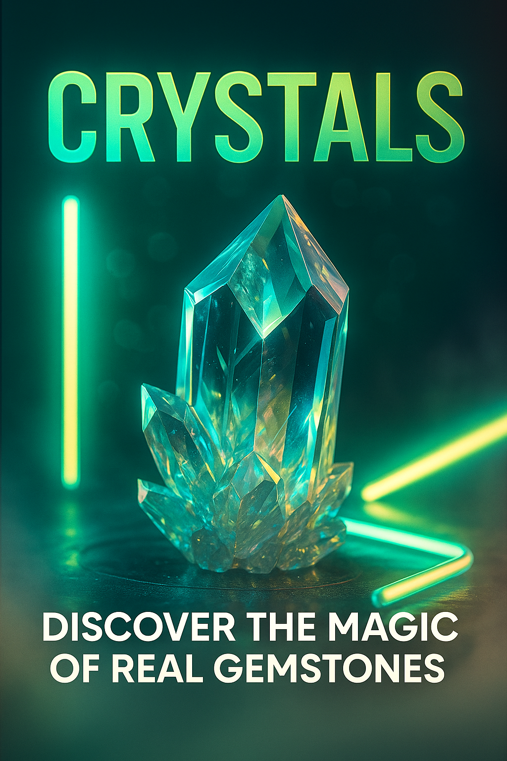 /Collection: /by davooda/Type: PNG/A vibrant slide design showcasing a crystal with neon accents and glowing elements. The title 'CRYSTALS' stands out prominently above a tagline about gemstones, creating an engaging visual.
