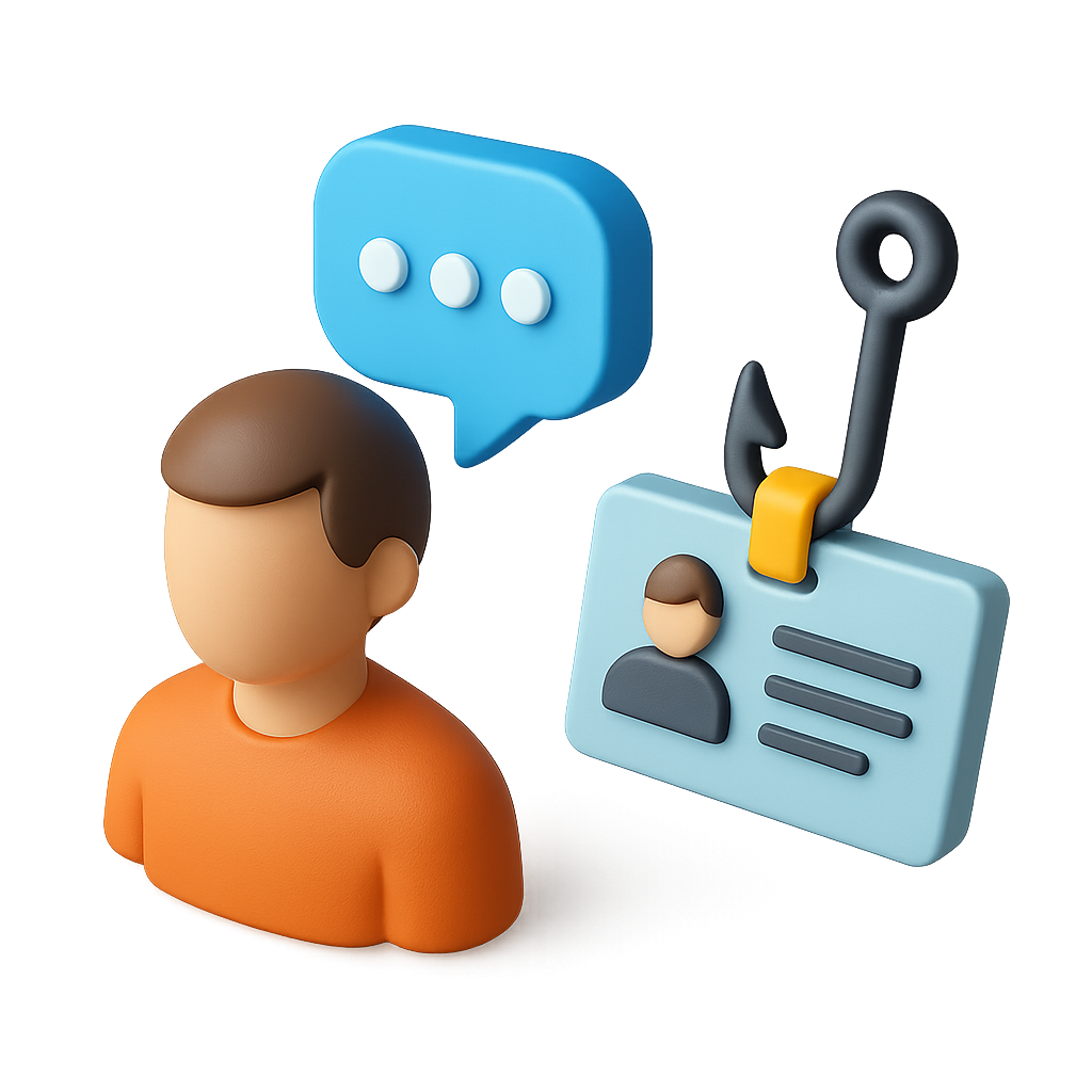 /Collection: /by davooda/Type: PNG/This image features a 3D icon depicting a user figure, a speech bubble, and a phishing hook with an ID card. The design showcases a modern isometric style with vibrant colors.