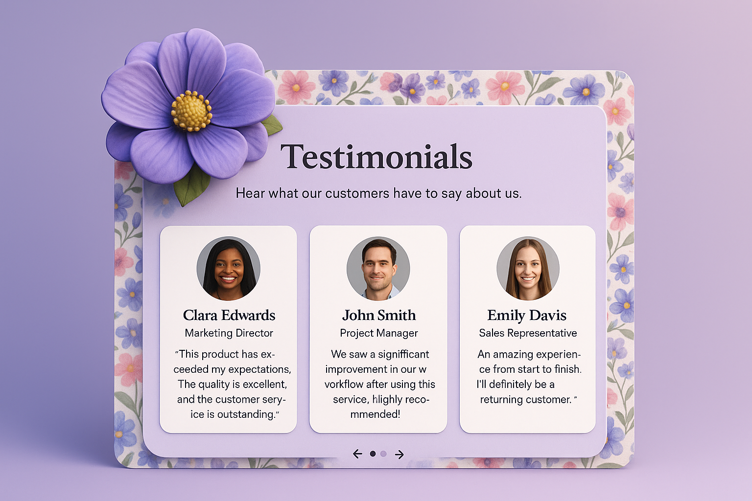 /Collection: /by davooda/Type: PNG/A visually appealing testimonials section featuring three cards with customer feedback, adorned with a large flower and floral patterns. Each card includes a circular author photo, name, position, and testimonial text.