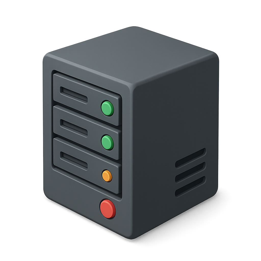 /Collection: /by davooda/Type: PNG/A sleek 3D icon of a server in a three-quarter isometric view, featuring three horizontal drive bays and colored buttons, all set against a transparent background.