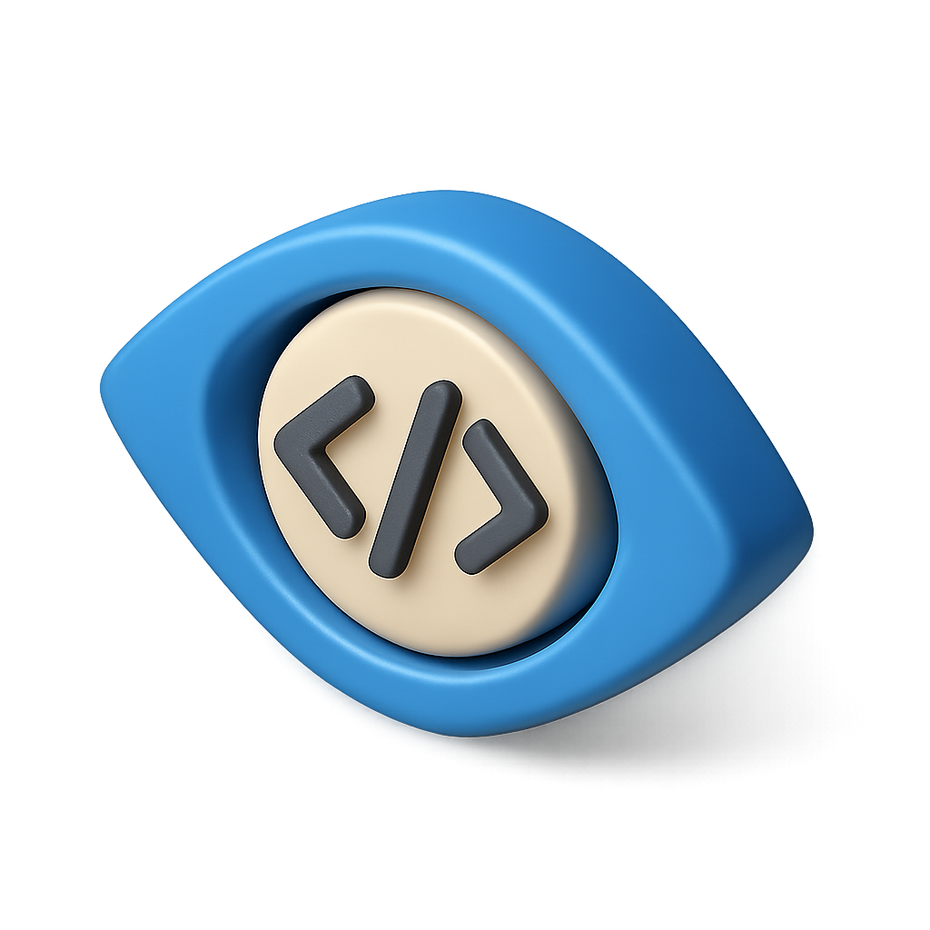 This image features a 3D eye icon designed with coding brackets, showcasing a sleek blue exterior and a cream-colored center. The isometric view enhances its volumetric effect, perfect for tech-related themes.