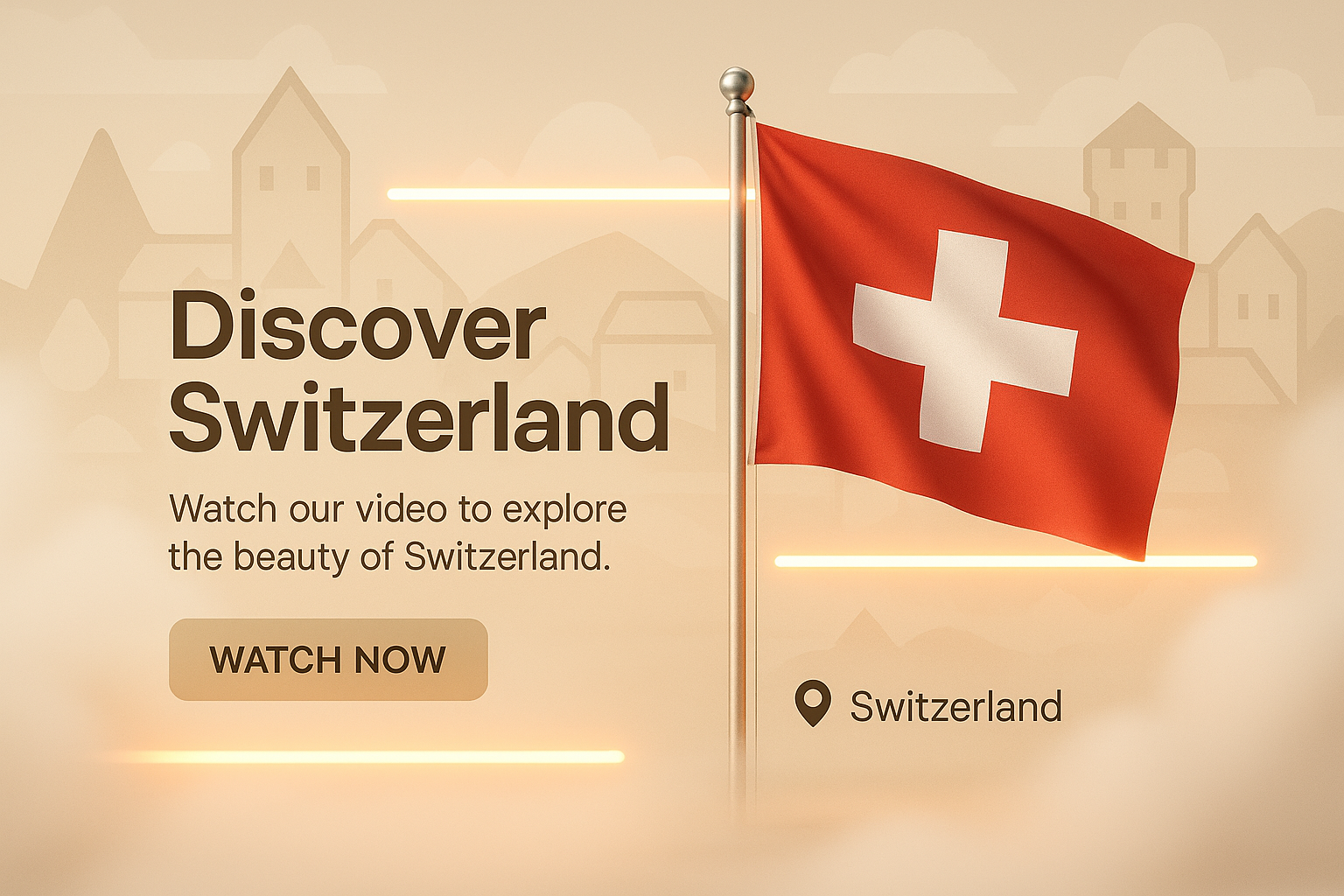 Engaging promotional graphic featuring the Swiss flag and a call to action, designed to entice viewers to explore Switzerland through video content. Ideal for tourism marketing.