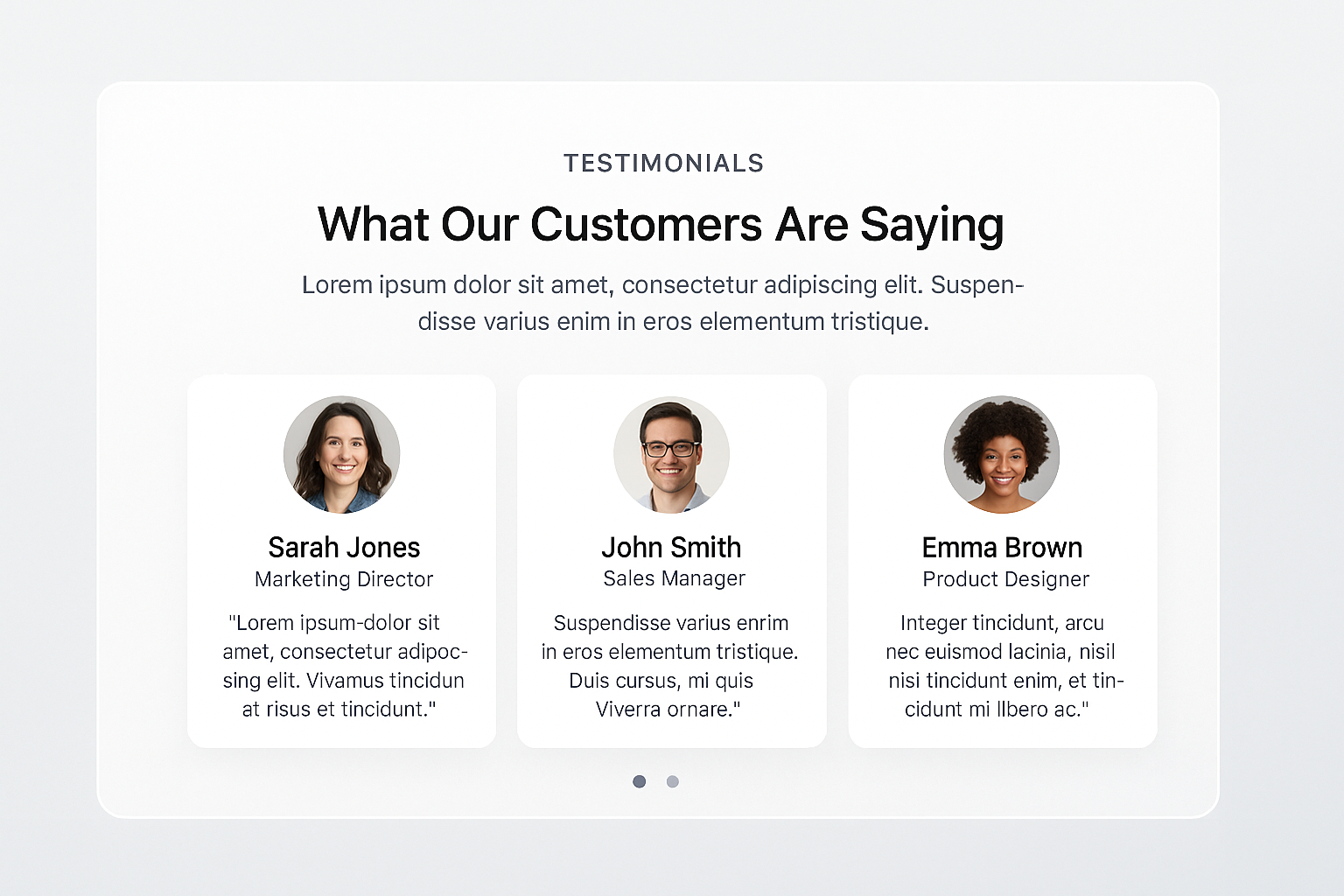 A visually engaging testimonials section featuring three cards with author photos, names, positions, and text. Clean layout enhances readability.