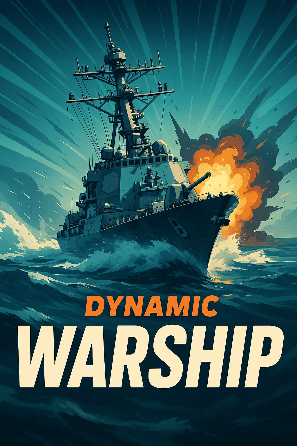 /Collection: /by davooda/Type: PNG/A powerful warship illustrated in a dynamic pose, cutting through waves with an explosion in the background. The title 'DYNAMIC WARSHIP' is prominently displayed in bold, engaging typography.
