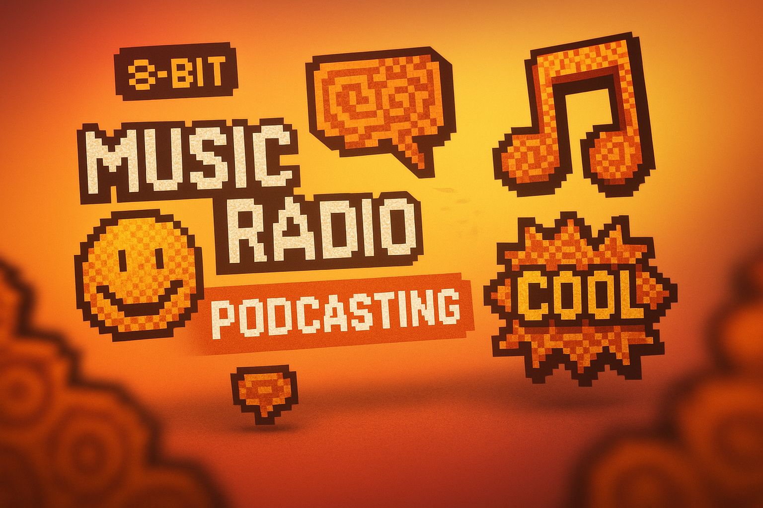 Vibrant 8-bit style graphic featuring elements related to music and podcasting, perfect for digital platforms focused on retro themes.