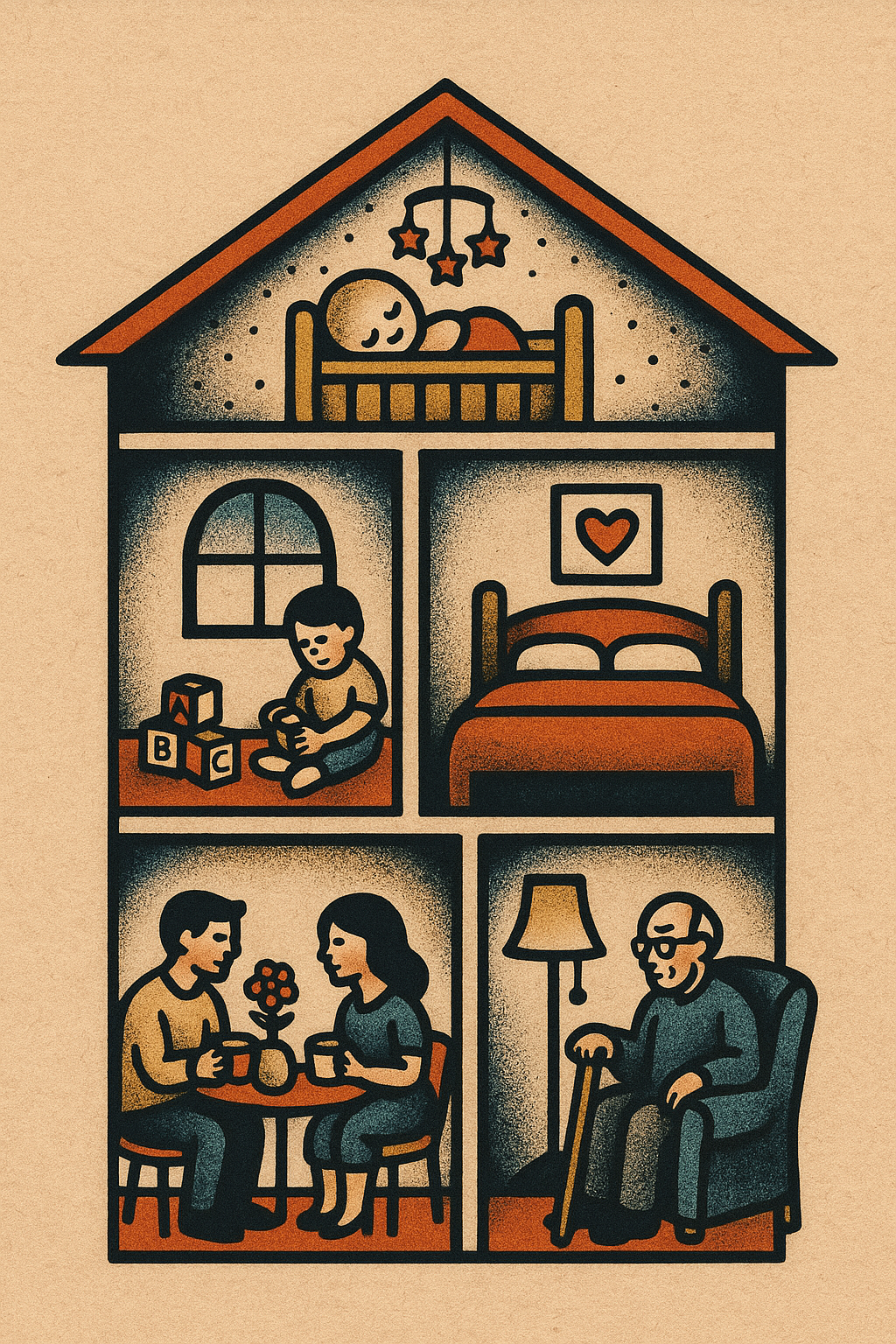 Life Stages Illustrated in a Home Setting