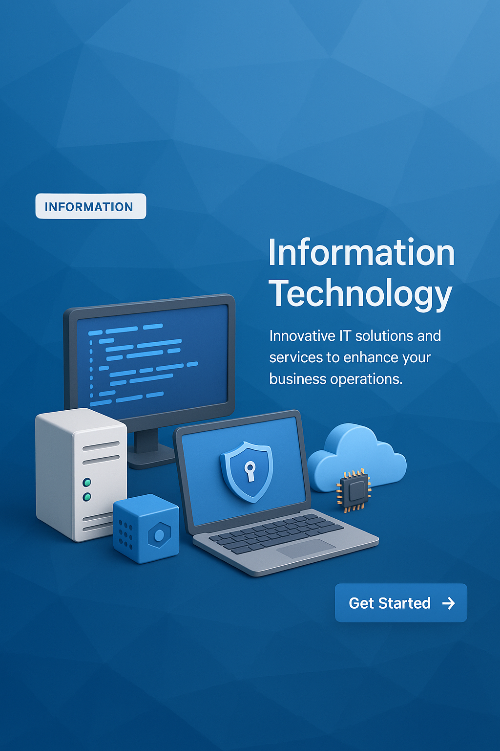 /Collection: /by davooda/Type: PNG/A visually appealing 3D illustration for an IT company featuring blue triangles. Includes a computer setup with relevant icons and text, designed for clarity and professionalism.