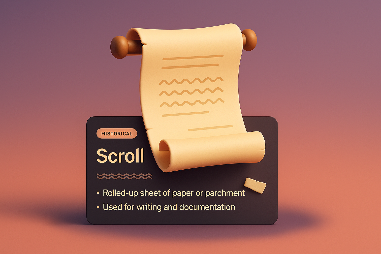 A visually engaging 3D design featuring a scroll on a dark background. The scroll includes a textured pattern and a label, perfect for web page layouts.