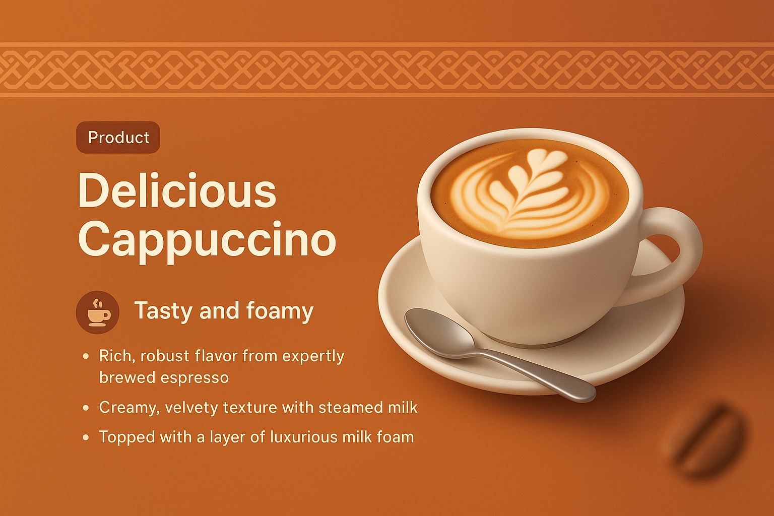 /Collection: /by davooda/Type: PNG/A visually appealing 3D illustration of a cappuccino in a white cup, showcasing rich frothy milk, artistic latte art, and a textured background. Perfect for promotional use.