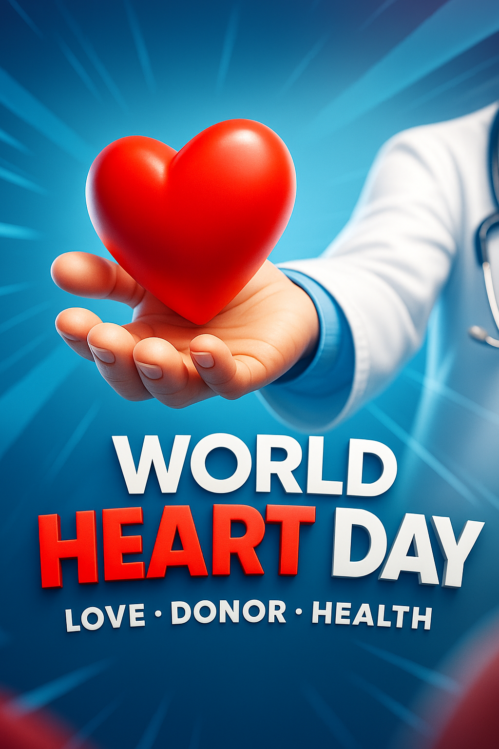 /Collection: /by davooda/Type: PNG/A doctor's hand presents a vibrant red heart against a dynamic blue background, symbolizing love and health for World Heart Day. The composition is engaging and professional.