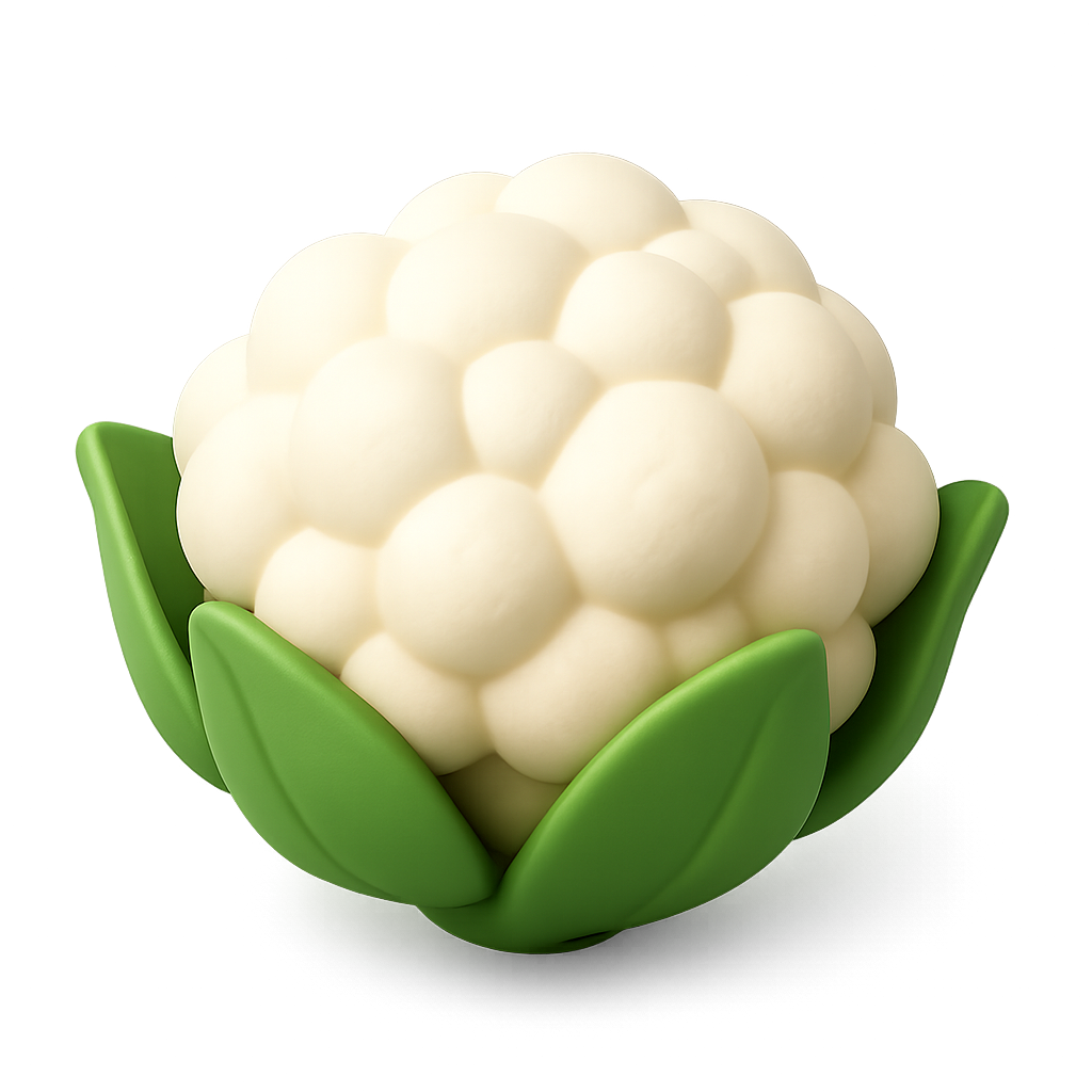 /Collection: /by davooda/Type: PNG/A visually appealing 3D representation of a cauliflower, featuring a white head and vibrant green leaves. The icon is designed in an isometric view with a transparent background.