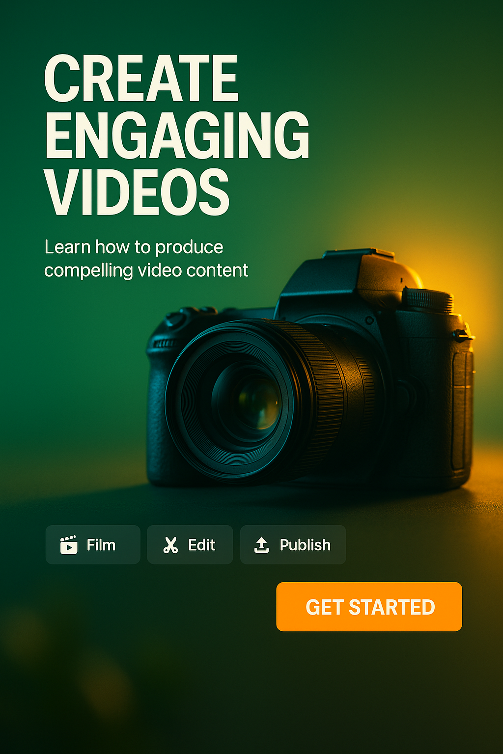 This image features a professional camera against a green background, promoting video production. It's designed for use in marketing materials, targeting aspiring filmmakers.