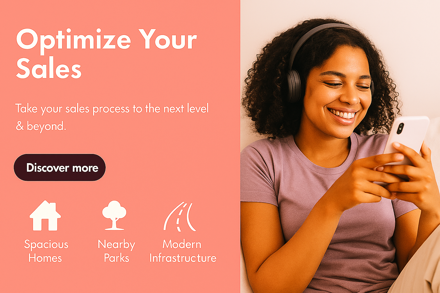 /Collection: /by davooda/Type: PNG/Engaging social media post featuring a young woman using a smartphone, promoting sales optimization services. The design includes modern elements and a friendly color palette, ideal for attracting potential clients.
