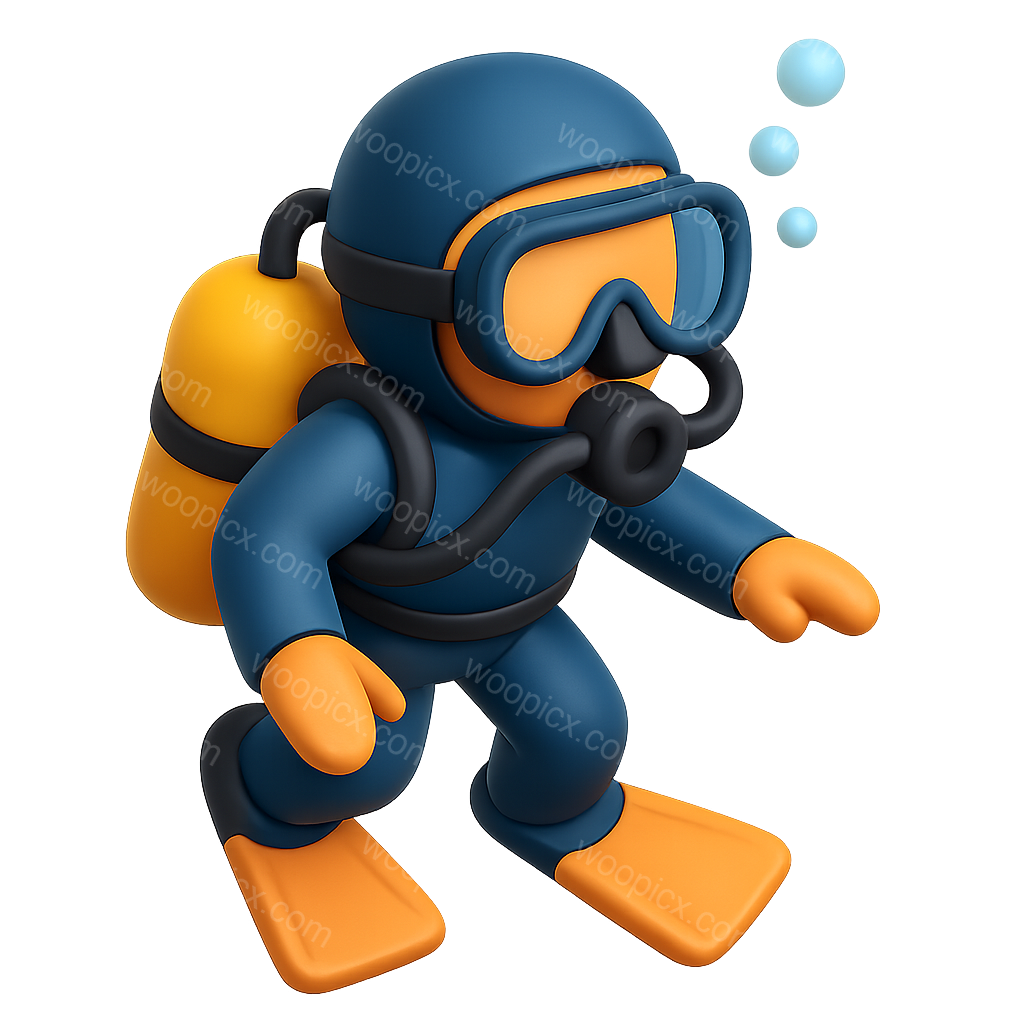 A stylized 3D icon of a scuba diver with a transparent background. The diver is depicted in a three-quarter view, showcasing vibrant colors and a volumetric design that emphasizes depth.