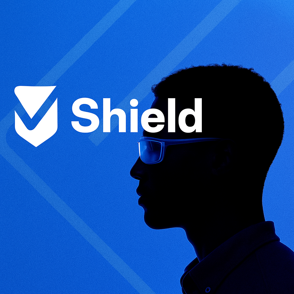 /Collection: /by davooda/Type: PNG/The image features a stylized silhouette of a person wearing glasses, prominently displaying the 'Shield' logo against a vivid blue background, creating a striking contrast.