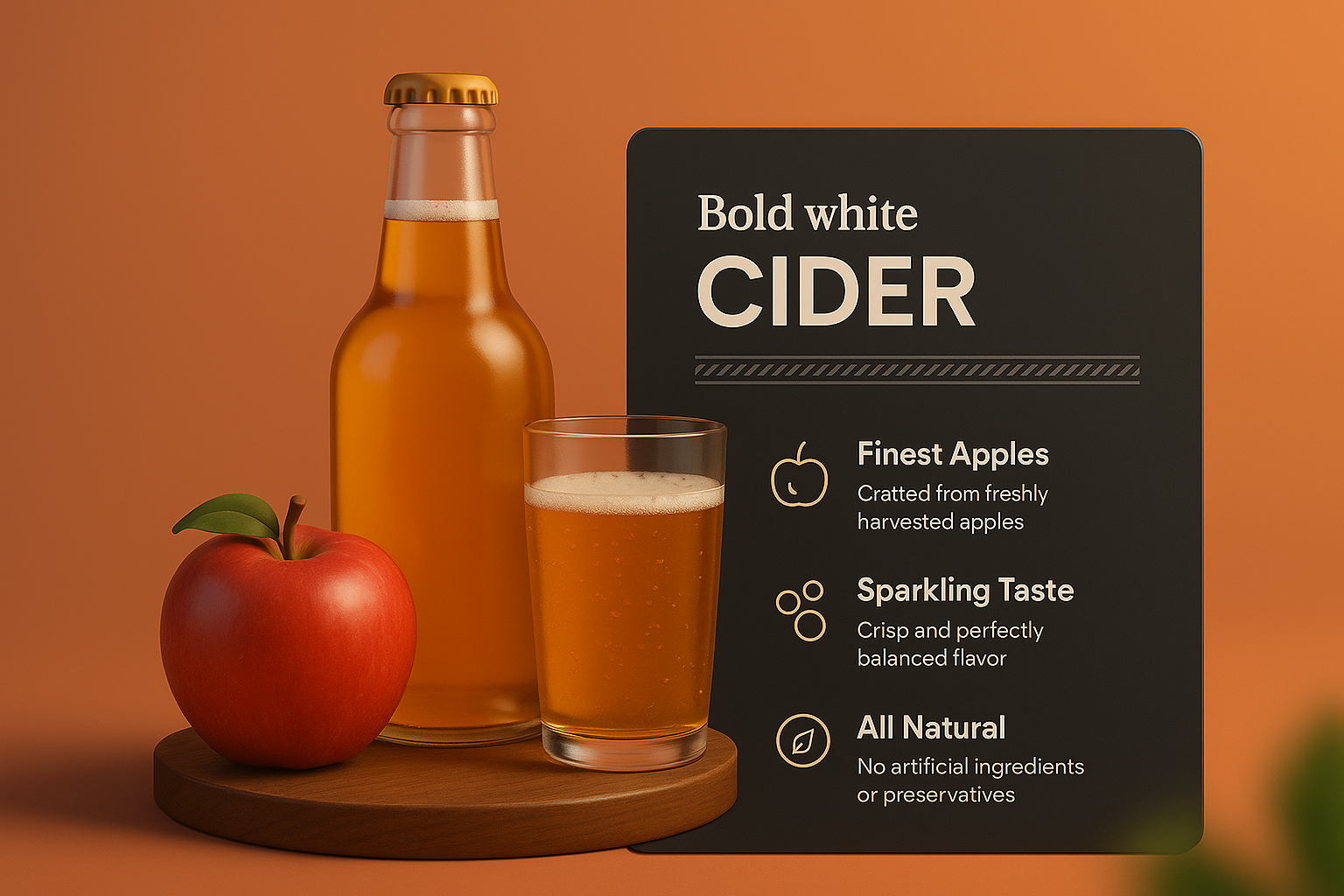 /Collection: /by davooda/Type: PNG/A visually appealing 3D illustration featuring a bottle of cider, a glass, and an apple on a wooden base. The design includes a dark panel highlighting key features of the cider.