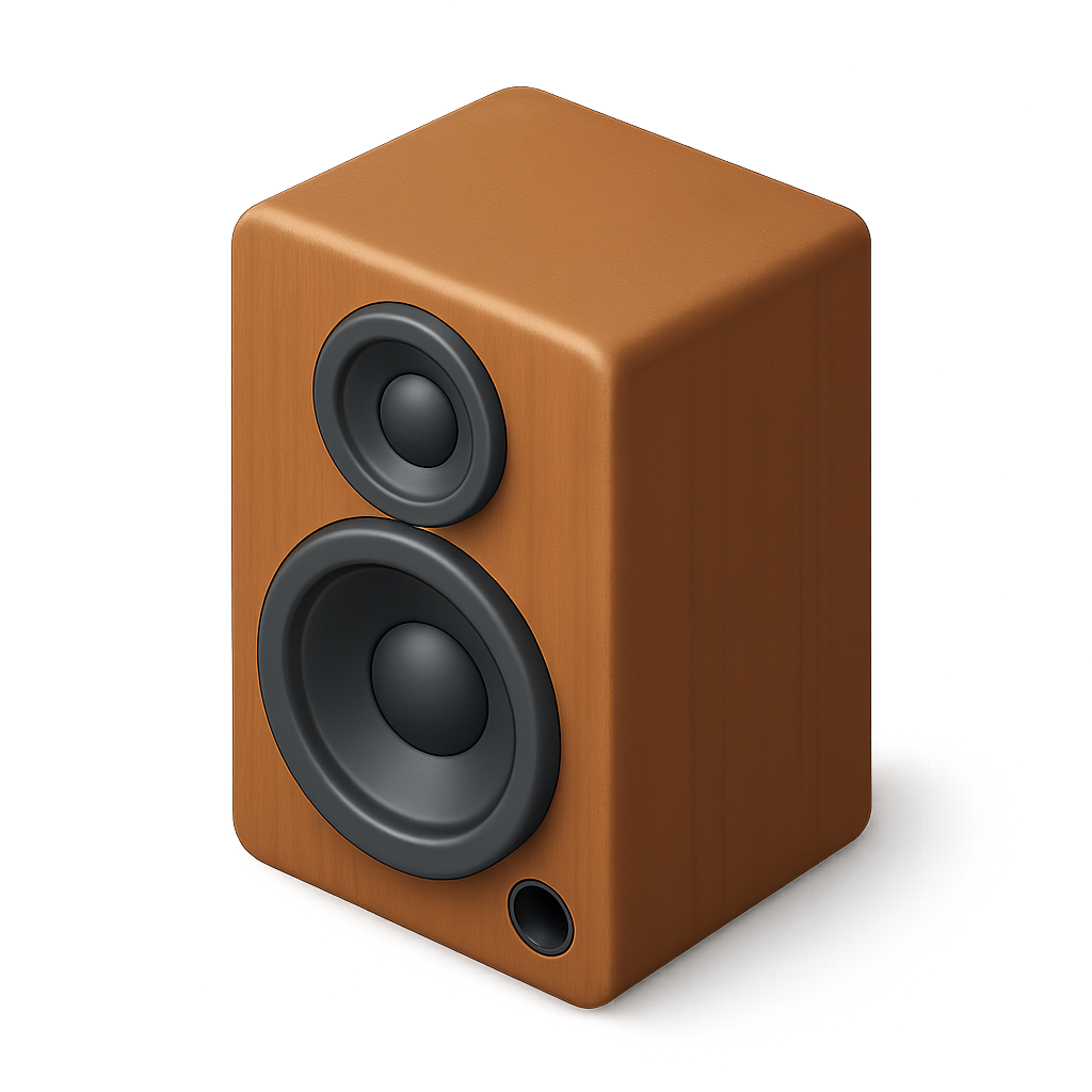 This image features a realistic 3D speaker icon rendered in a three-quarter view. The speaker has a wood finish with two distinct speaker cones and a sleek design, set against a gradient background.