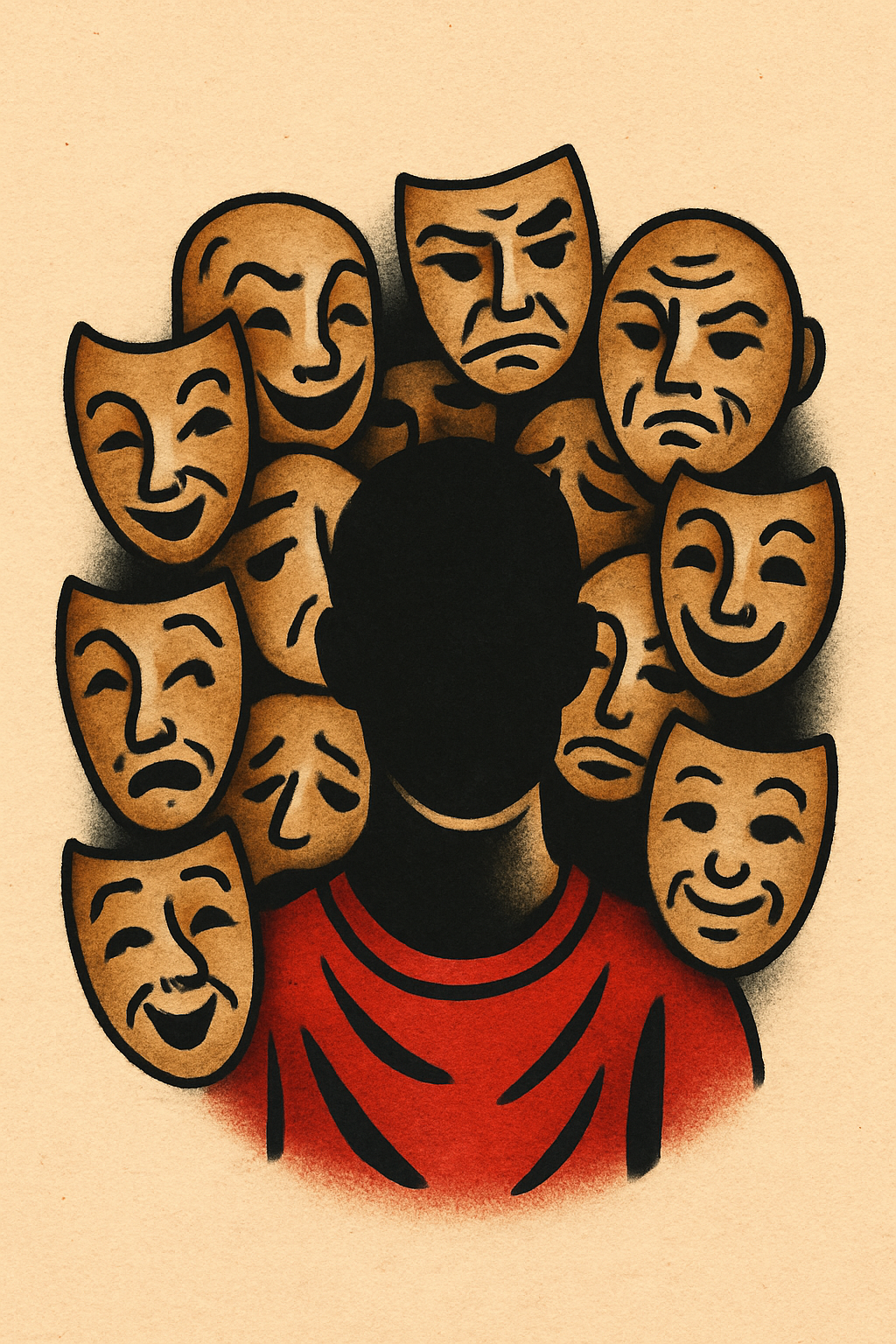 /Collection: /by davooda/Type: PNG/The image features a faceless silhouette surrounded by various theatrical masks, showcasing a blend of emotions. The character wears a red garment against a light beige background, emphasizing the tattoo-inspired design.