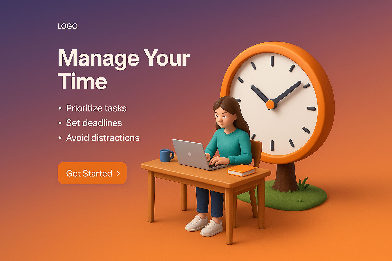 /Collection: /by davooda/Type: PNG/A stylized 3D scene featuring a girl working at a desk with a large clock. The background transitions from gradient to solid colors, enhancing focus on the text elements promoting time management.