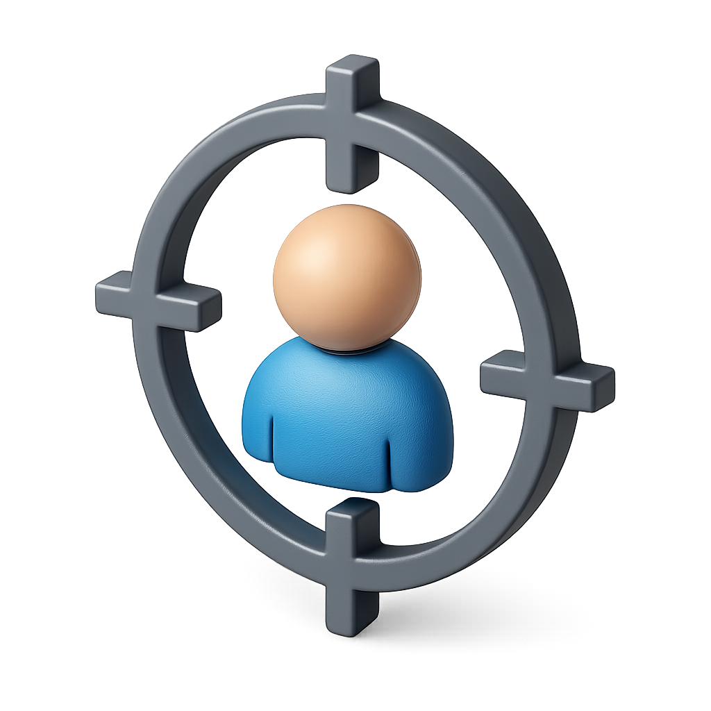 A 3D icon featuring a person figure enclosed within a target symbol. The design is volumetric with a sleek, isometric view, set against a dark background.
