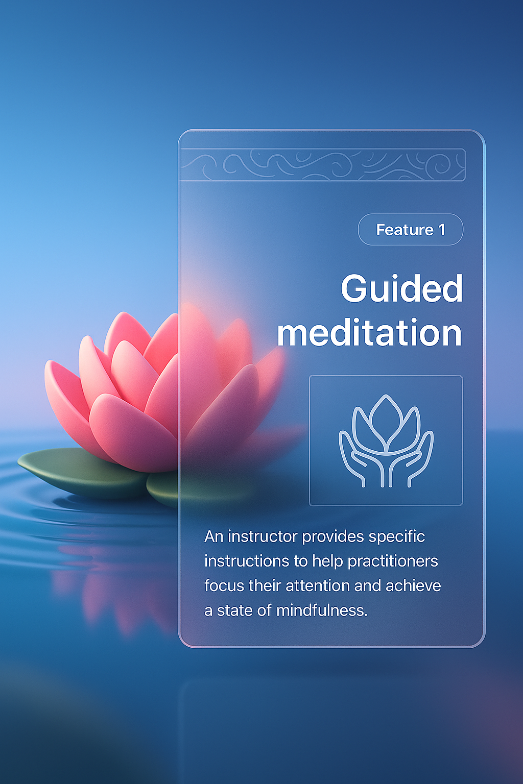 A serene illustration of a zen lotus flower on water, symbolizing meditation. The design features a transparent overlay with text about guided meditation.