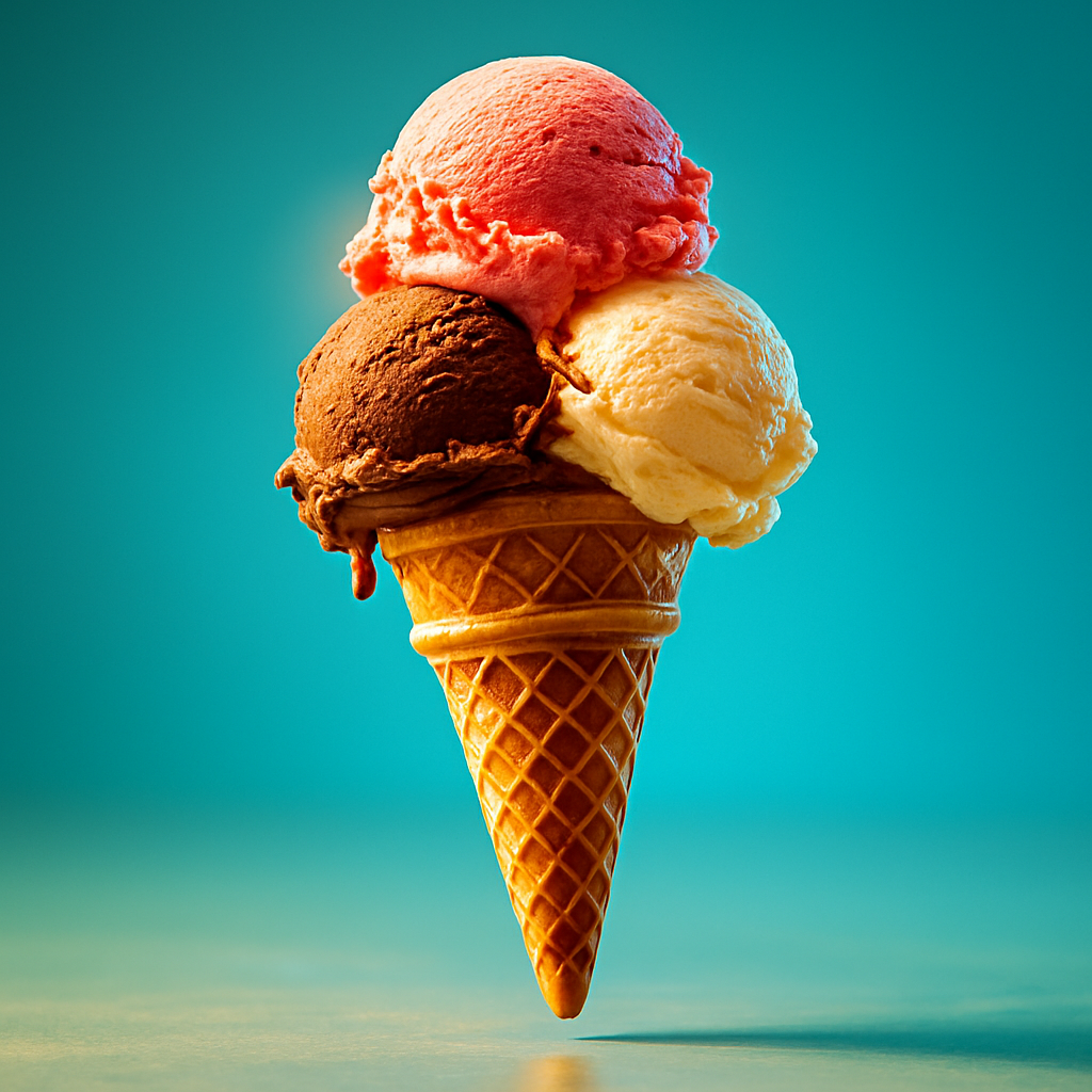 /Collection: /by davooda/Type: PNG/A visually striking image of a three-scoop ice cream cone, featuring chocolate, strawberry, and vanilla flavors, suspended in mid-air against a vibrant gradient background. The scene is well-lit from both sides, creating appealing reflections and highlights.