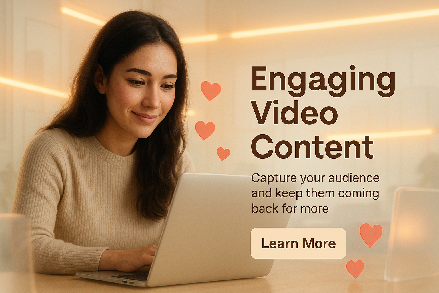 A promotional graphic featuring a woman using a laptop to create video content, designed to attract audiences and encourage engagement. Ideal for marketing campaigns in digital content creation.