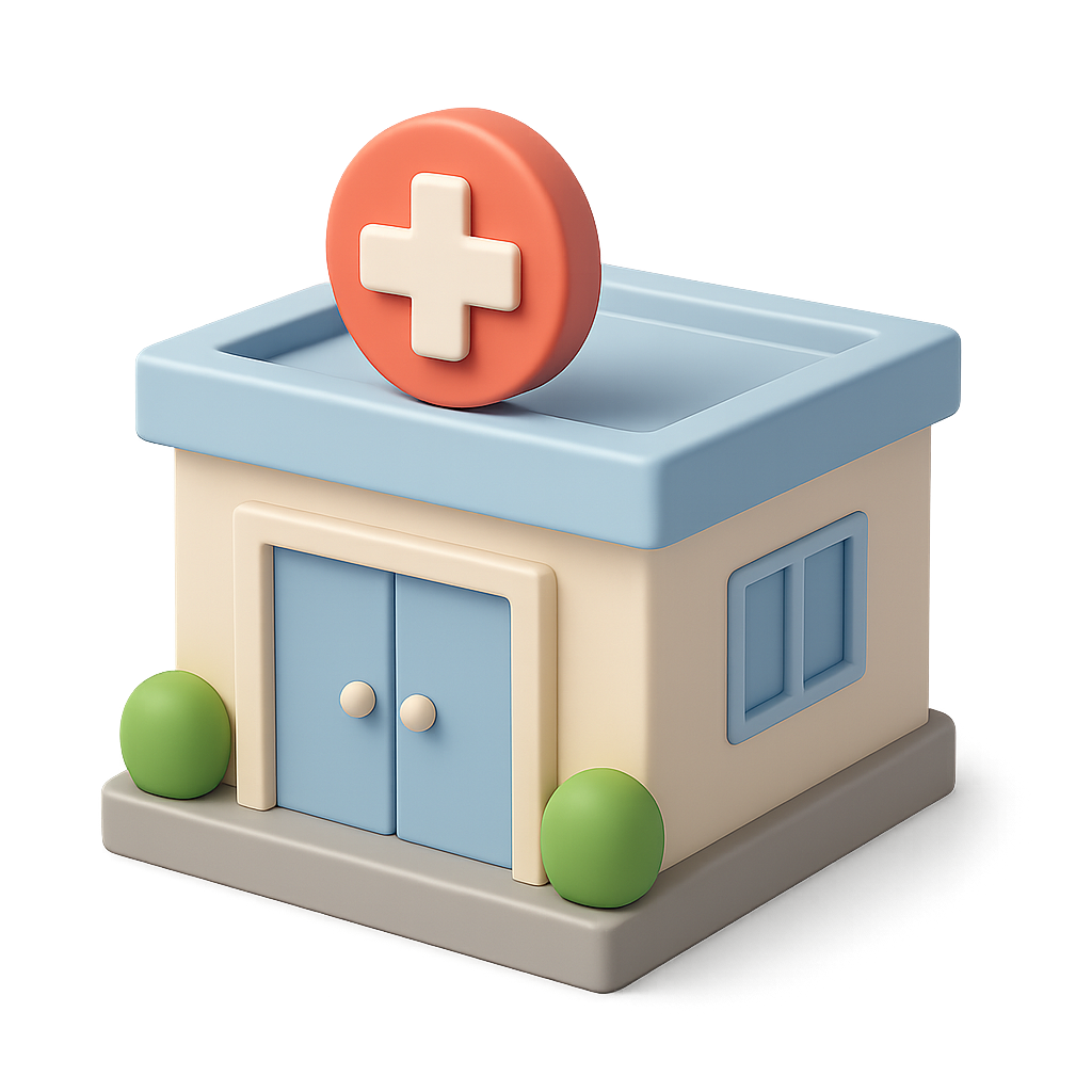 A vibrant 3D icon of a clinic shown in a three-quarter view, featuring a red cross symbol, soft colors, and a simple, playful design.