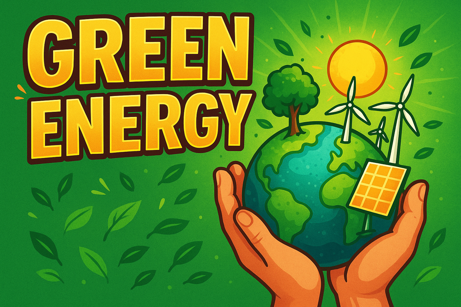 /Collection: /by davooda/Type: PNG/Colorful graphic depicting hands holding the Earth with renewable energy elements like wind turbines and solar panels, emphasizing environmental sustainability. Ideal for eco-friendly campaigns.