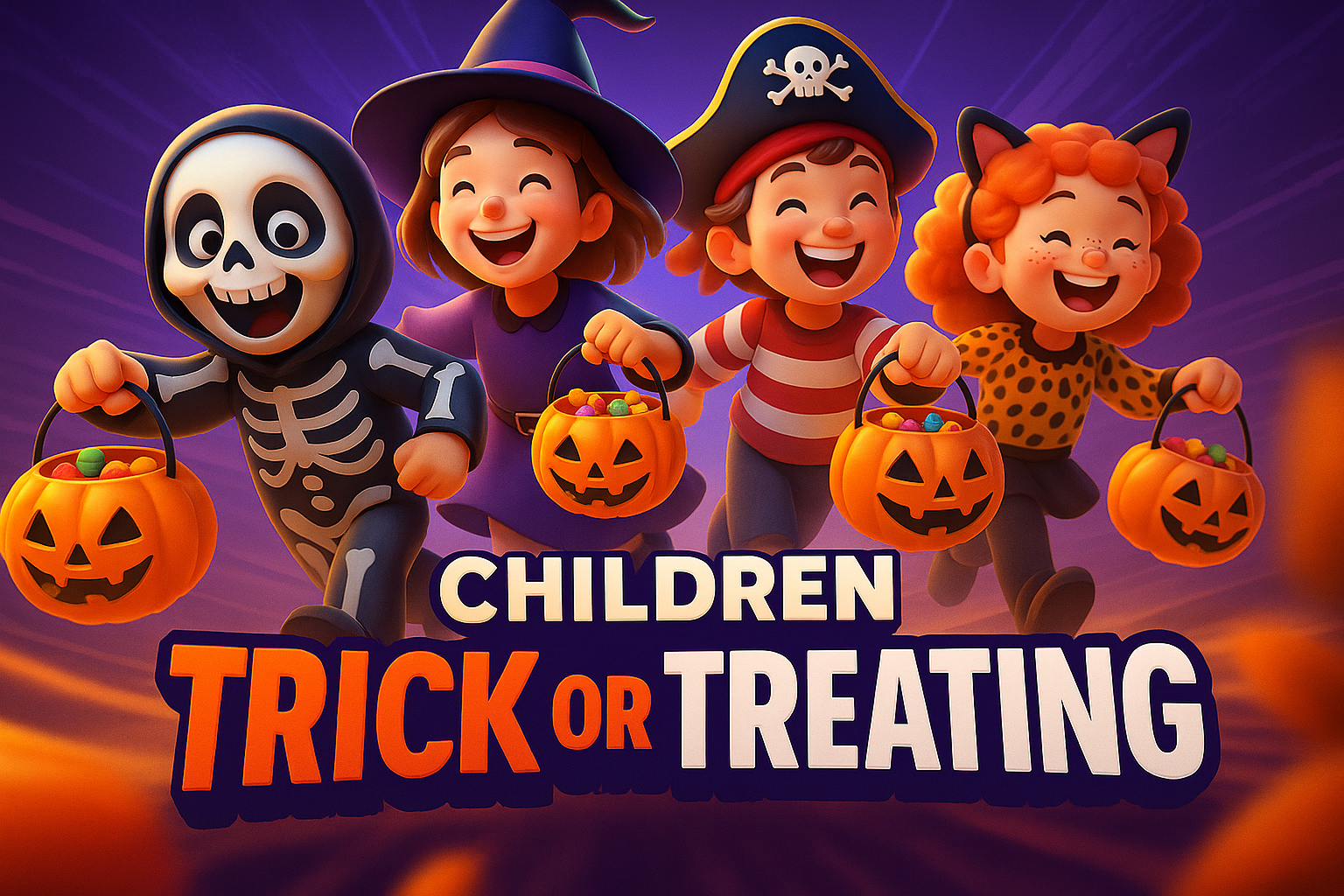 /Collection: /by davooda/Type: PNG/A vibrant scene of children dressed in costumes, joyfully trick-or-treating with Jack-O-Lantern candy buckets. The background features dynamic colors and playful elements, creating an engaging Halloween atmosphere.