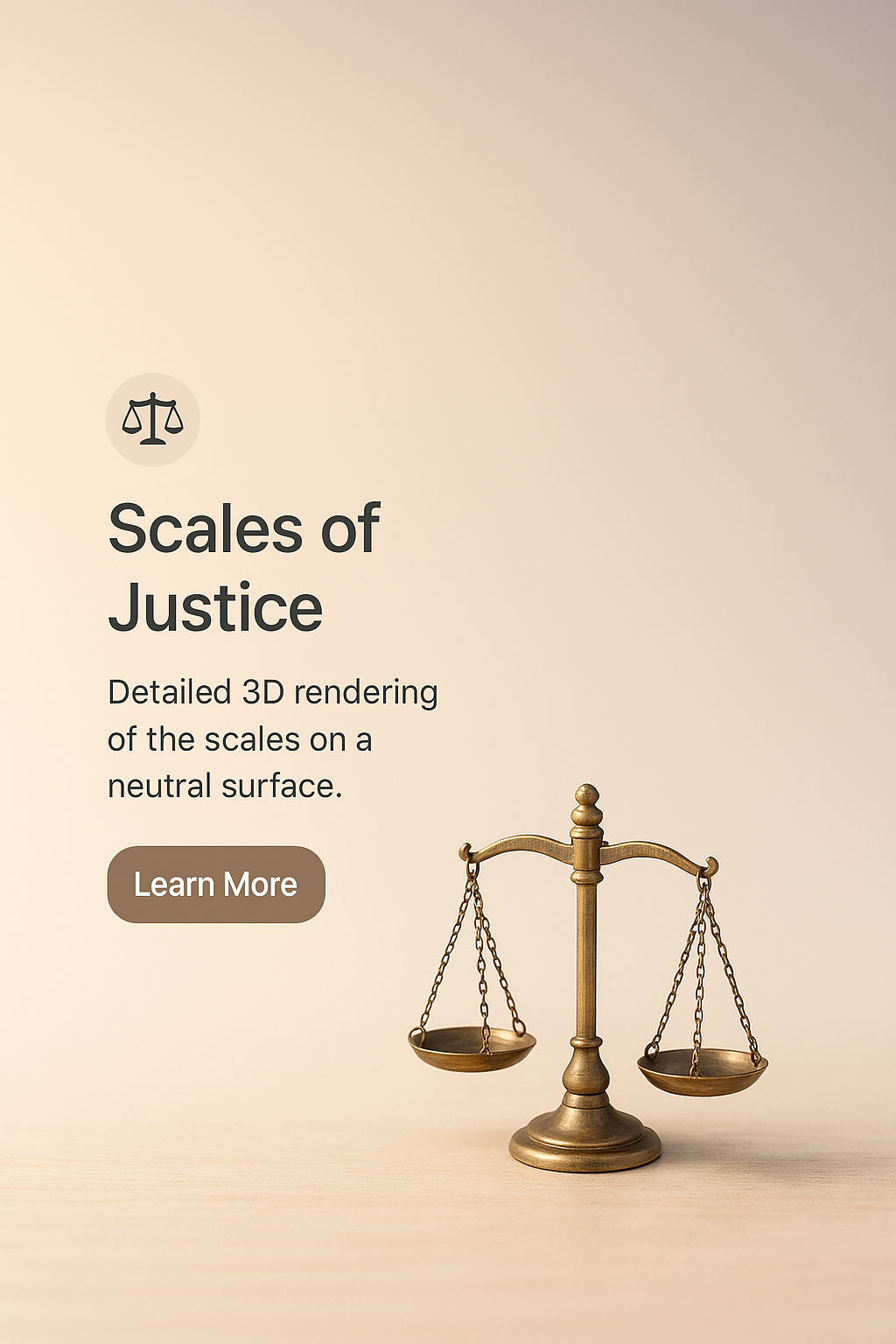 A detailed 3D rendering of the scales of justice set against a smooth gradient background, emphasizing realism and simplicity in design.
