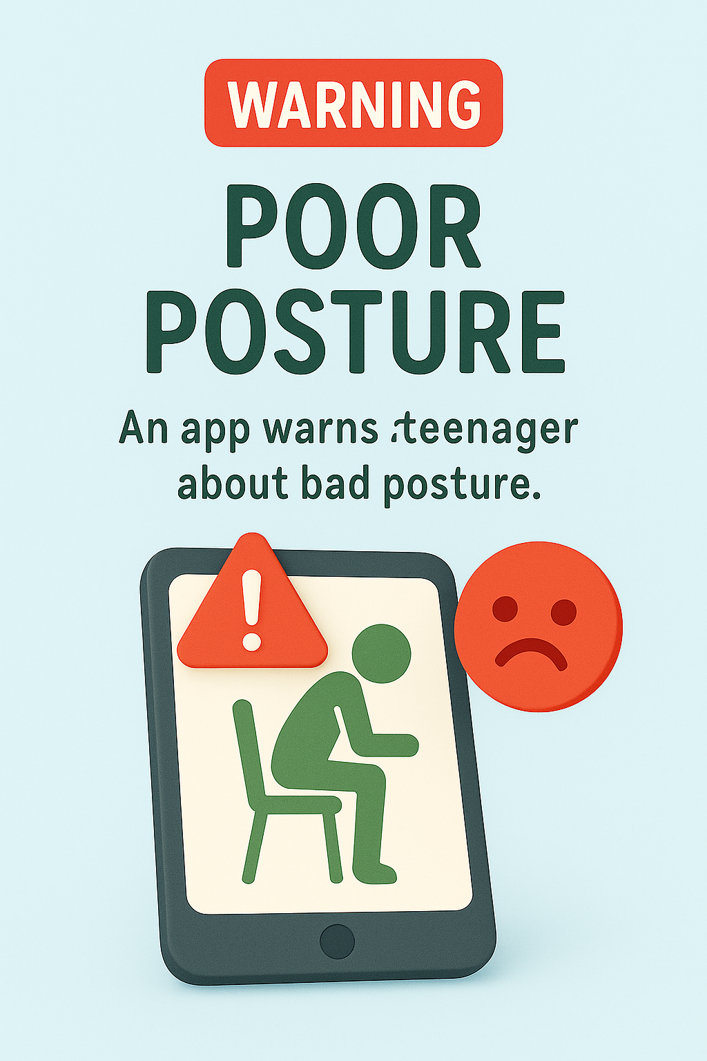 Informative graphic showcasing a posture warning for teenagers, featuring a smartphone illustration with a clear message about poor posture. Ideal for app promotion or educational content.