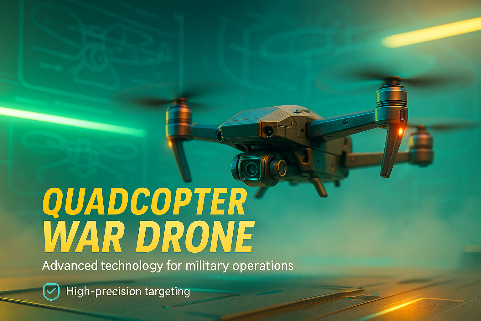/Collection: /by davooda/Type: PNG/Dynamic image showcasing a quadcopter war drone, emphasizing advanced technology and military applications. The futuristic design and green lighting create a high-tech atmosphere.