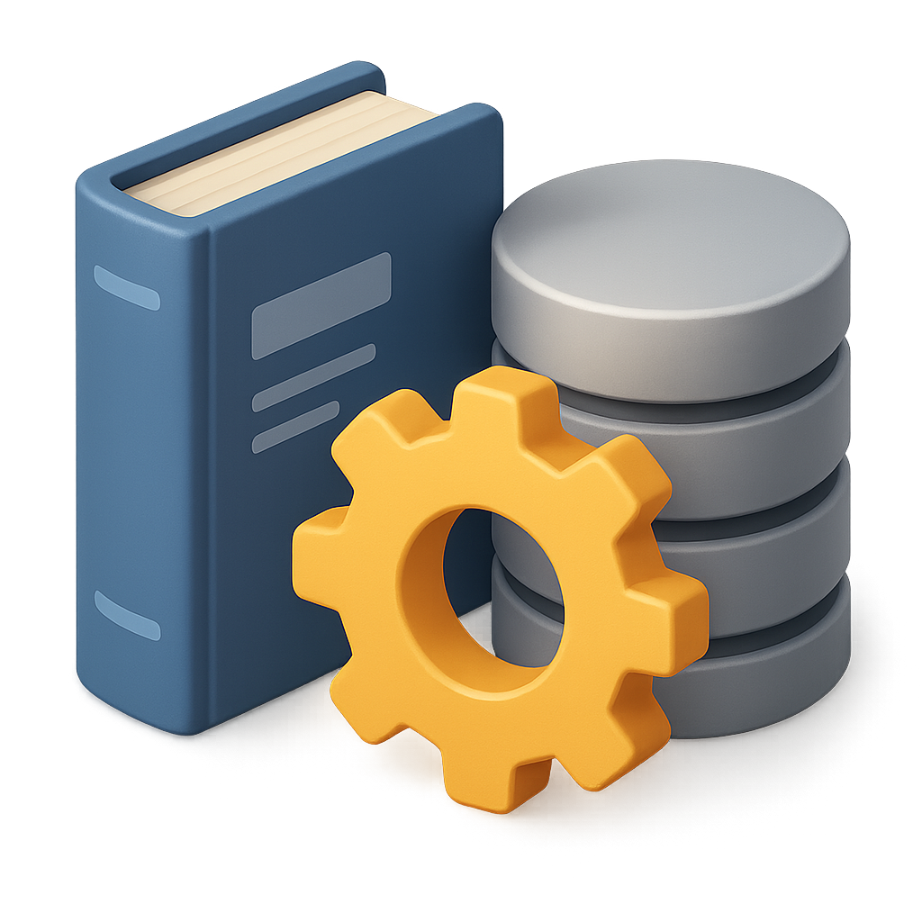 /Collection: /by davooda/Type: PNG/A visually appealing 3D icon showcasing a blue book, yellow gear, and gray disks. The design features a three-quarter view with a transparent background, emphasizing a modern data-mining theme.