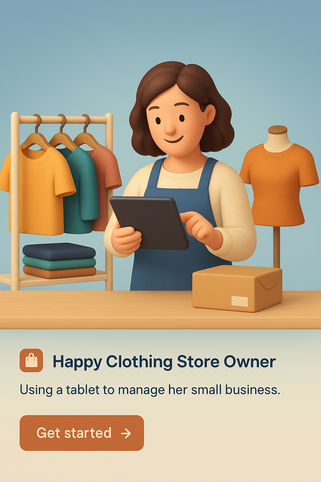 /Collection: /by davooda/Type: PNG/A cheerful clothing store owner uses a tablet to manage her small business. The scene is zoomed out, showing a well-organized store with colorful clothing items displayed.